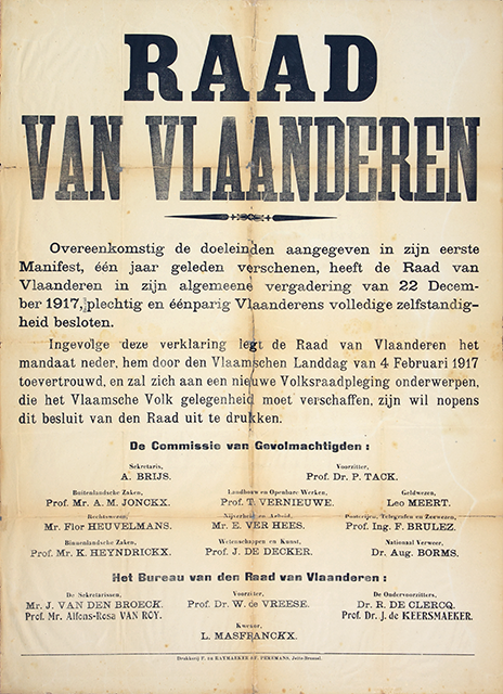 In the context of the First World War, a small section of the Flemish Movement was influenced by the policy of the German Empire – which occupied Belgium during the war – which was aimed at radicalizing the Flemish question in order to destabilize Belgium. This ‘Flamenpolitik'[Flemish Politics] would help to contribute to the establishment of the pro-German (radical) ‘Council of Flanders’ which would ultimately declare independence in December 1917. After the Great War, a part of the members of the Council would flee to the Netherlands, trying to plead with the Entente powers and the American President Roosevelt to keep the Flemish issue in mind during the Versailles Peace Talks (see Pro Flandria Servanda). In addition, radicalized collaborators during the war (also known as ‘activists’) woudl play a crucial in the formation of the Flemish nationalist political parties ‘Vlaamsche Front'[Flemish Front] and “Vlaamsch National Verbond” [Flemish National Union] during the interwar period.