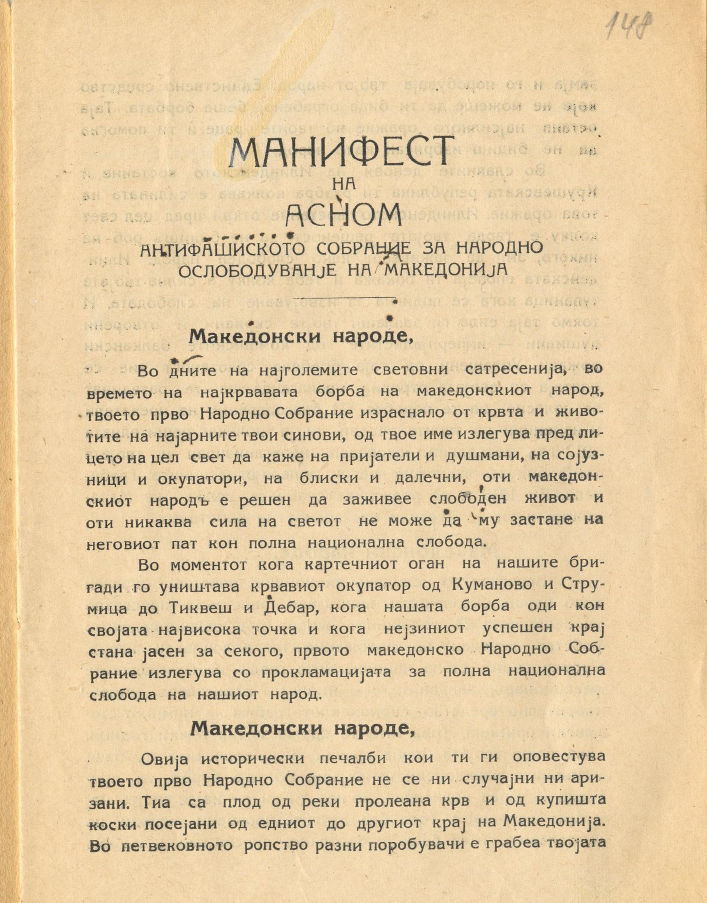 Manifest issued at the first session of the Anti-fascist Council of National Liberation of Macedonia to the people of Macedonia