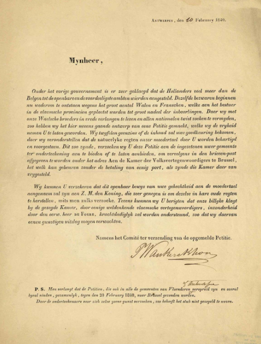 Generally marked as the first time the Flemish movement would formulate a political programme of any sorts, the “petionnement” was formulated as a response to the linguistic policies as outlined in the new Belgian constitution following its independence in 1830. The petition – which would ask for linguistic reforms on both the state level and via the foundation of Flemish cultural institutes – would serve as a template for future endeavours of the Flemish movement in the following decades, and would contribute to the emergence of a political Flemish national movement. Its direct consequences would be the emergence of the movement in general (as outline by the Declaration) and of the first political attempt to address the “grievances” of the Flemish movement (see Flemish Commission)
